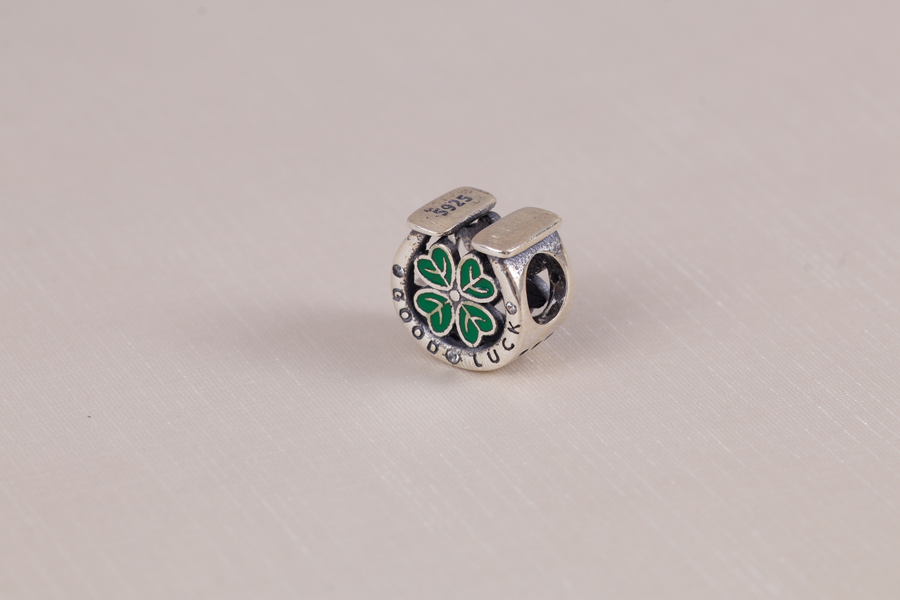 PINGENTE EM PRATA, SEPARADOR, FERRADURA COM 3 ZIRCÔNIAS ESCRITA ''GOOD LUCK'' E TREVO RESINADO, 10,70mm ALTURA