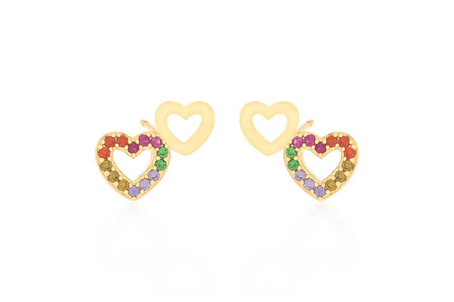 BRINCO BANHADO EM OURO, CORAÇÃO 9mm LARGURA COM ZIRCÔNIAS BRANCAS OU COLORIDAS