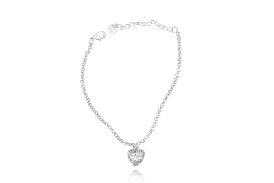 PULSEIRA BANHADA EM RÓDIO BRANCO, ELO PORTUGUÊS 2,50mm DIÂMETRO, 17cm COMPRIMENTO E CORAÇÃO 11mm LARGURA